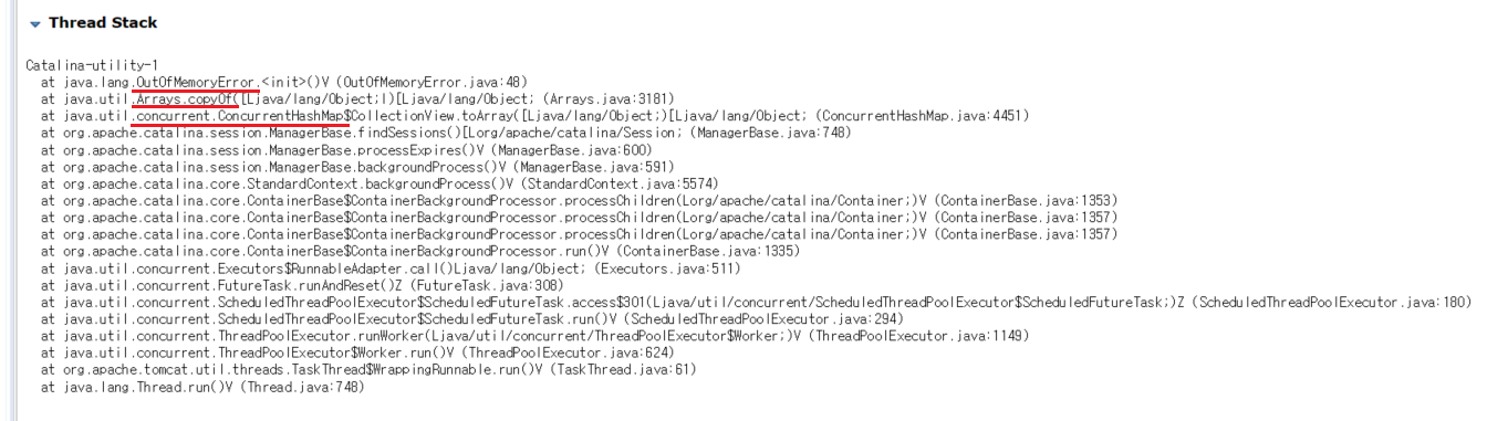 또한 Thread stack 로그를 분석한 결과 agent request 를 받아 session 을 생성하기위해 배열을 복사하는 과정에서 OOM 에러가 발생한것을 확인 할 수 있었습니다.