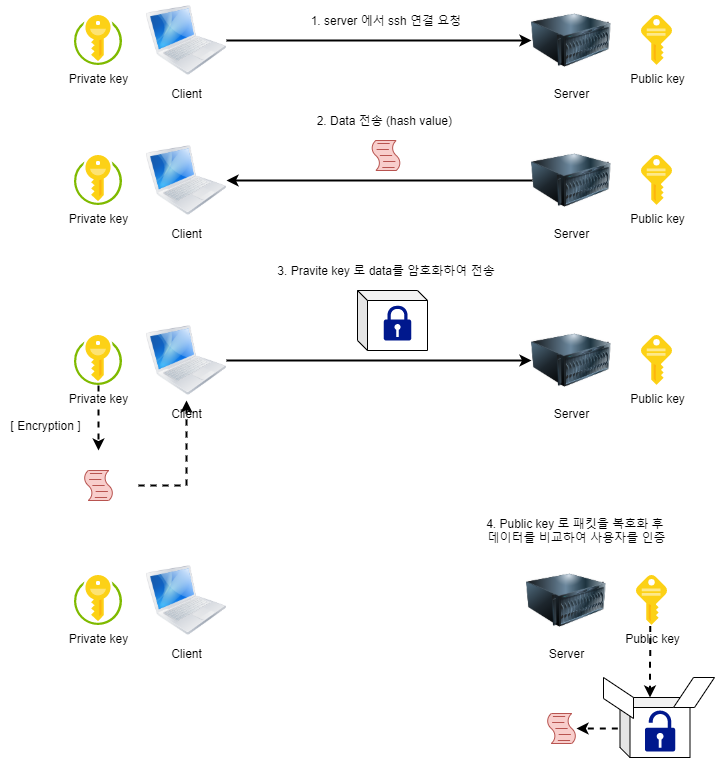 이번 포스팅은 SSH의 개념, 사용자 인증흐름, AWS 사용 예시까지 확인해보려합니다. 참고로 해당 포스팅에서 ssh 사용예시로 AWS EC2와 MobaXterm 을 사용하였으며, 해당 서비스와 프로그램에 대한 구체적인 사용방법이 아닌 개념을 이해하기위한 맥락관점에서 설명 할 예정입니다. * AWS EC2 : 아마존 웹 서비스에서 제공하는 클라우드 서비스 (PaaS) * MobaXterm : SSH, SFTP 등의 원격 접속을 할 수 있는 프로그램 1. 개념 - SSH는 secure shell 의 약자로써 원격지 PC에 보안접속을 할 수 있는 CLI 기반 프로그램 또는 암호화 프로토콜을 의미합니다. * CLI (Command Line Interface) : 명령줄 인터페이스 ( GUI ) 2. 특징 2...