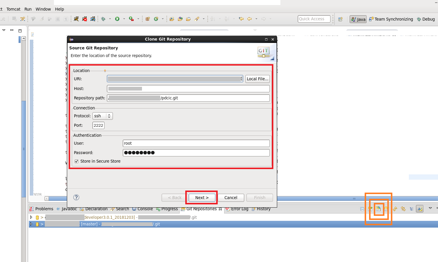 소프트웨어 개발시 협업을 위해사용하는 eclipse git 의 사용방법에 대해서 포스팅하려고 합니다. 이것은 ( Version: Mars.2 Release (4.5.2) ) 버전을 기준으로 작성하였으며, 향후 제조사에 의해서 사용방법이 변경 될 가능성이 있으니 맥락을 파악하는것을 추천드립니다. clone 은 remote Repository (from git server) 에 특정 프로젝트를 local Repository로 다운받는것을 말합니다. 참고로 remote Repository는 서로 연관된 다수의 프로젝트가 포함되어 있습니다. (RDBM과 비교하면 DB = repository , table = project 와 유사한 관계를 가지고 있습니다.) 1. git server 정보 입력 eclipse 의..