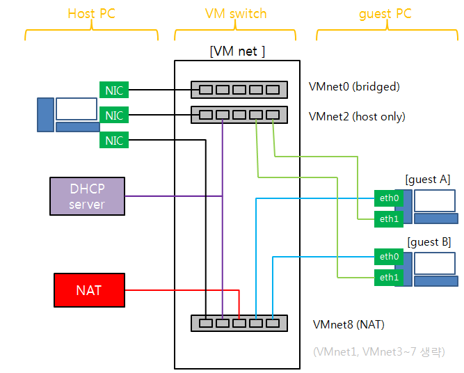 이번 포스팅은 VM (Vitual Machine : 가상머신) 를 통해서 computer network의 구성을 파악하는것에 목적이있습니다. 그렇기 때문에 구체적인 VM의 설정방법에 대해서는 설명하지 않습니다. 다만 용어와 네트워크 구성에 대해서는 초심자도 이해 할 수 있도록 서술하려고 노력하였으니 도움이 되길 바라겠습니다. host PC 는 window7 이며 guest PC는 linux (centOS) 로 2개의 가상머신이 VM ware 에 설치되어있다는 전재하에 진행 할 것이며, 2개의 가상머신을 각각 guest A/B 로 칭하겠습니다. [환경] VM ware : VM ware workstation 16 pro 15.0.2 build-10952284 host PC : window 7 guest PC..